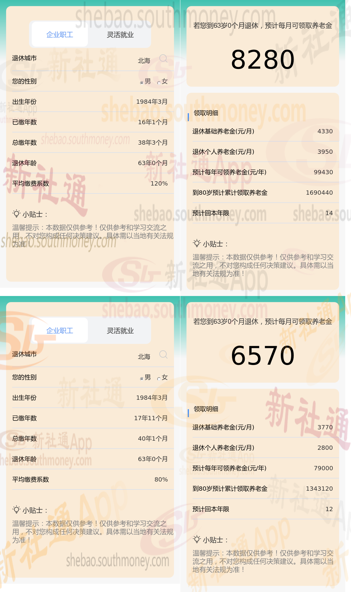 老杜:退休城市北海,缴费年限40年,退休年龄63周岁,但是按80%缴纳社保。