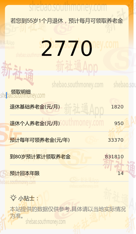 因此,柯某预计每月可领取的养老金总额为基础养老金与个人养老金之和,即1820元 +950元 = 2770元。这一估算结果由新社通app养老金计算器提供。