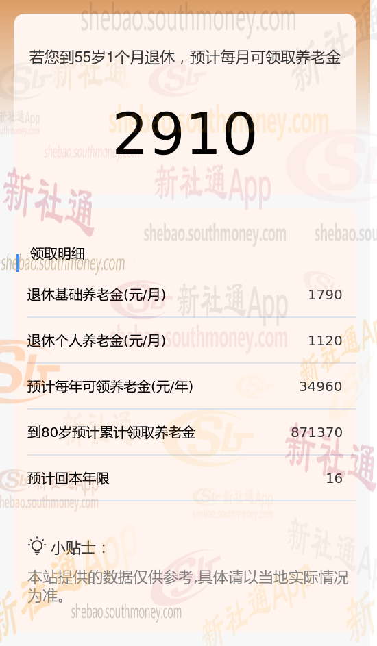 每月可领养老金=基础养老金+个人养老金≈1790+1120≈2910元。