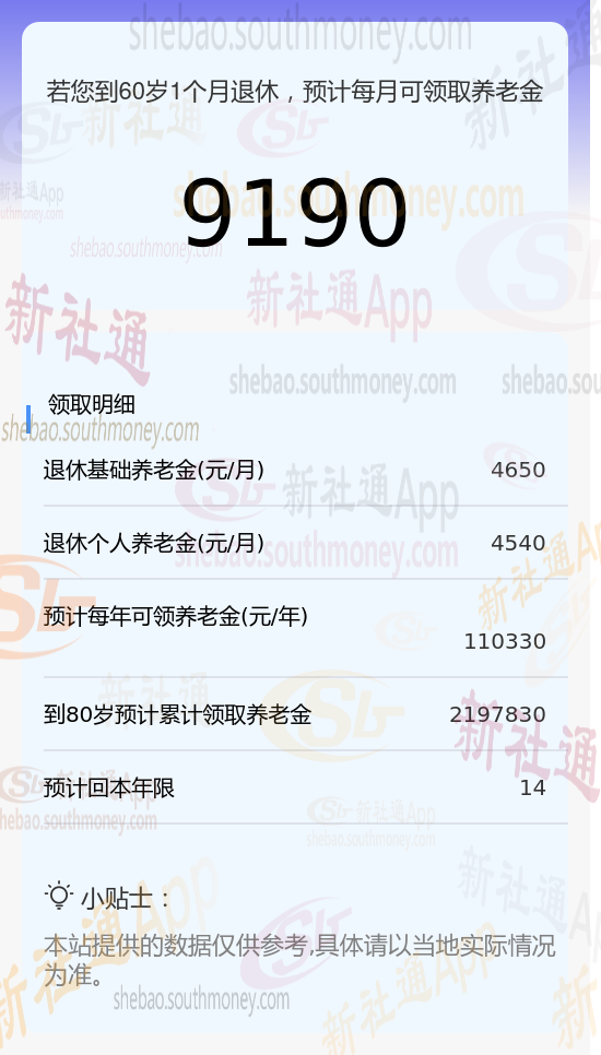 每月可领养老金总额:将基础养老金与个人养老金相加,每月可领取的养老金总额约为9190元(4650元+4540元)。