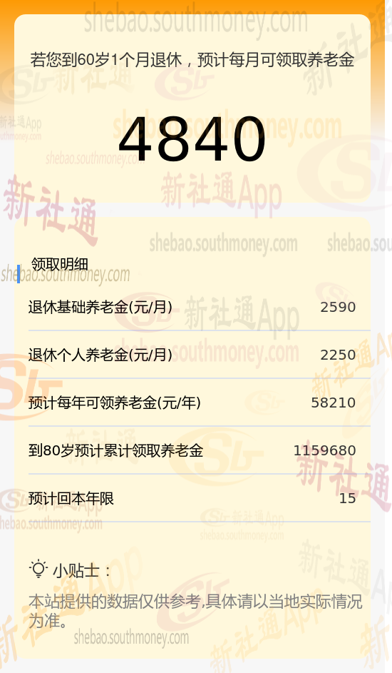 每月可领养老金=基础养老金+个人养老金≈2590+2250≈4840元