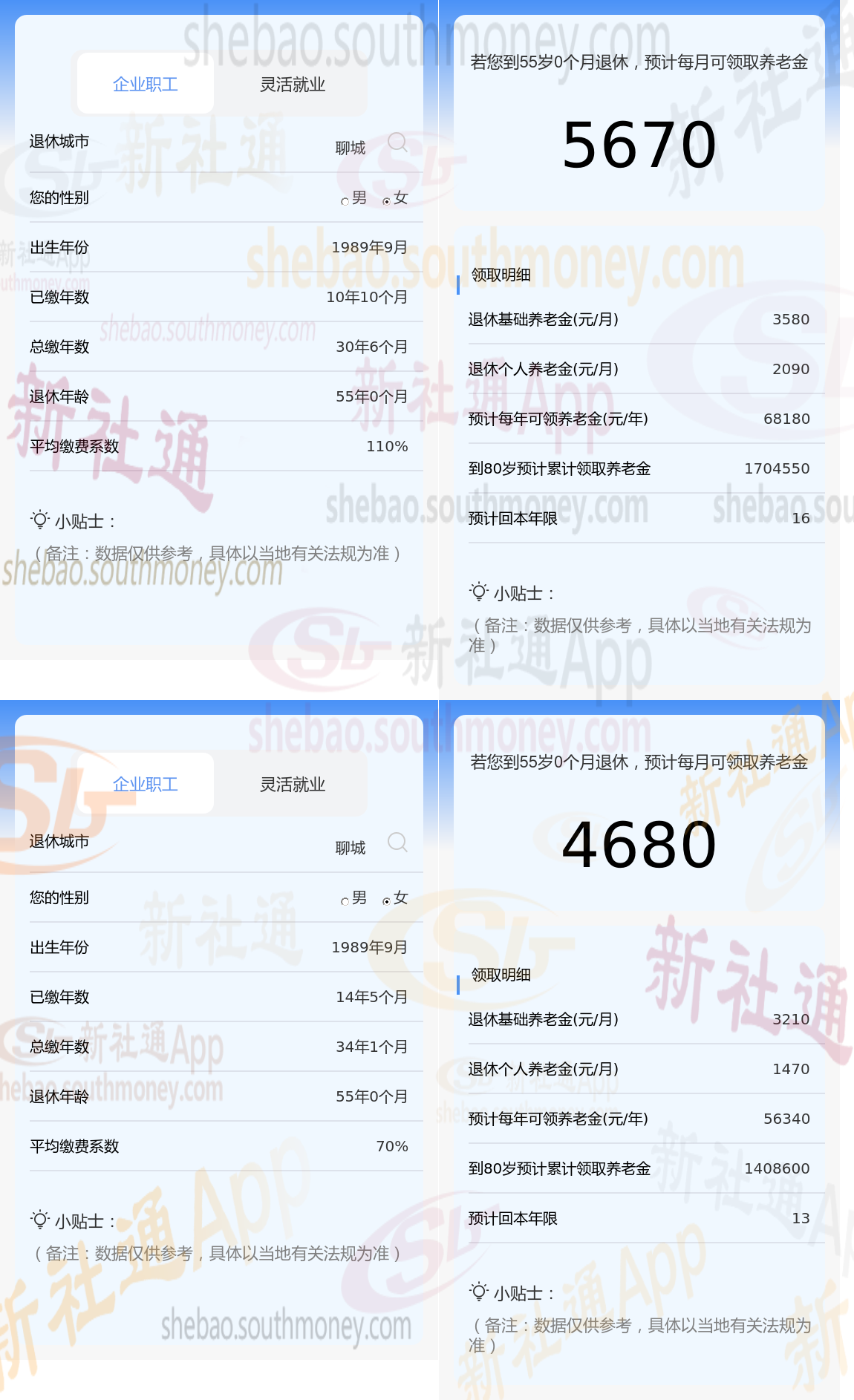老何:退休城市聊城,缴费年限34年,退休年龄55周岁,但是按70%缴纳社保。