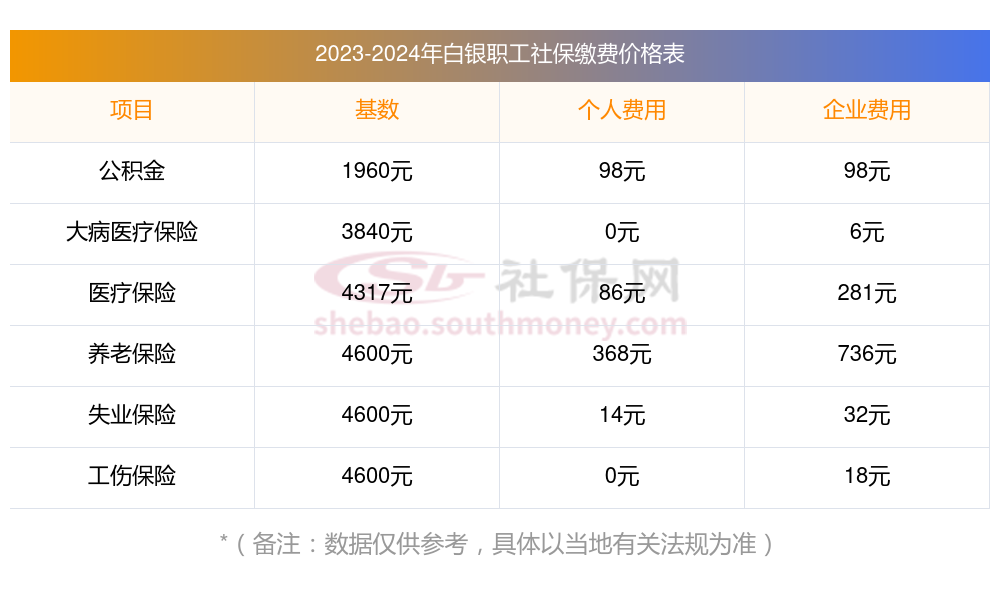 2025年白银社保缴费多少钱?下表是2024-2025年白银社保费用明细参考,新社通app-社保缴费查询工具提供的最新数据如下: