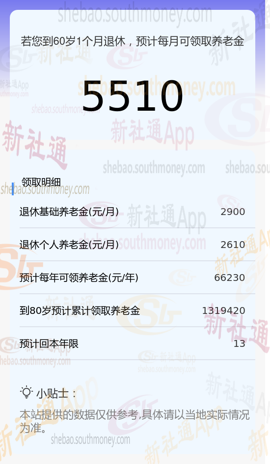 基于这些关键信息,我们使用新社通app养老金计算器对他未来的养老金进行了详细估算:
