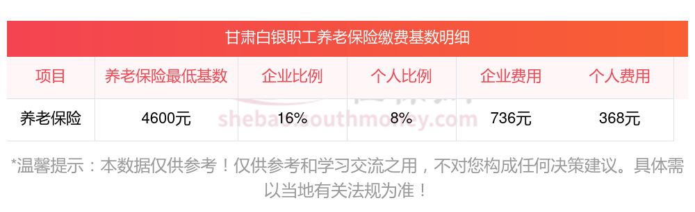 据新社通app显示,甘肃白银企业职工养老保险的缴费基数为:4600元。