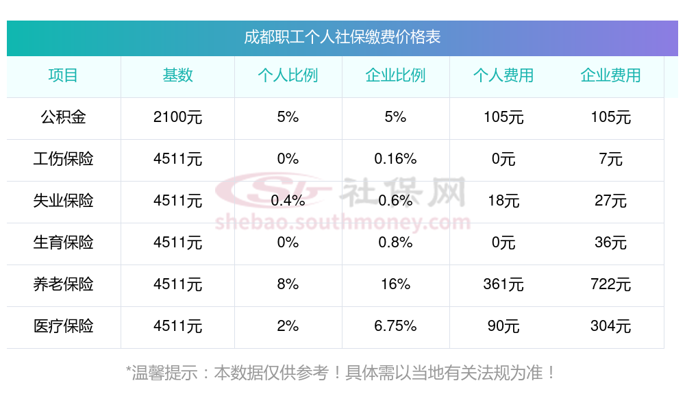 2025年成都社保缴费多少钱?下表是2024-2025年成都社保费用明细参考,新社通app-社保缴费查询工具提供的最新数据如下: