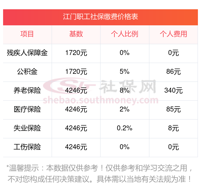 社保缴纳比例一览,社保公司和个人各交多少?下表是2023-2024年江门社保费用明细参考,新社通app-社保缴费查询工具提供的最新数据如下: