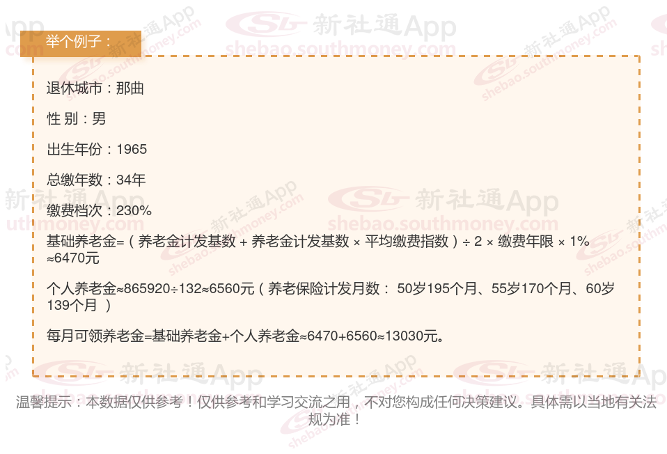 退休城市:那曲,性别:男,出生年份:1965,总缴年数34年,缴费档次:230%,新社通app养老金计算器所得:
