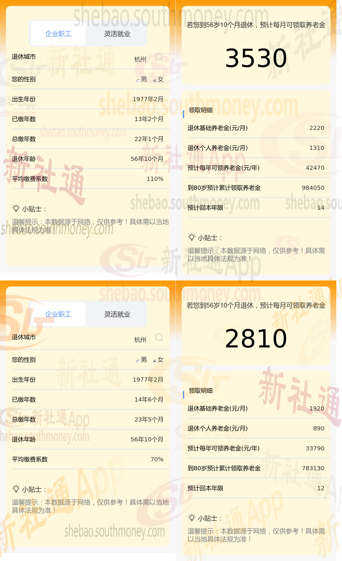 杨某退休城市:杭州,缴费年限:22年,退休年龄:56周岁,缴费系数:110%