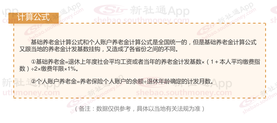 基础养老金:其计算公式为(全省上年度在岗职工月平均工资+本人指数化月平均缴费工资)÷2×缴费年限×1%。其中,本人指数化月平均缴费工资=全省上年度在岗职工月平均工资×本人平均缴费指数(本人平均缴费指数最高为300%,最低为60%,指数在0.6~3之间)。