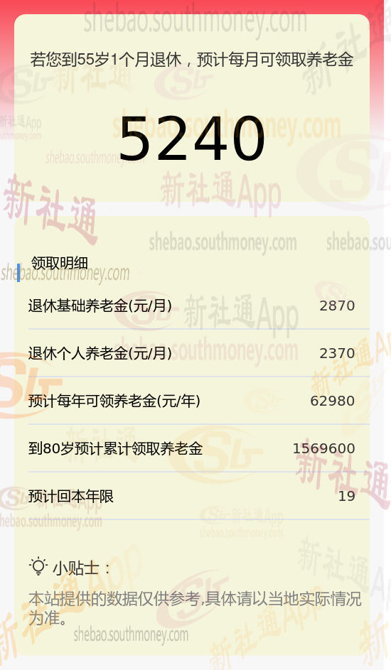 社保按240%档次缴费的沈某,海口城市退休,出生于1970年,工龄21年,女性。岁月流转,她终于迎来了自己的退休年龄。根据新社通app养老金在线计算器计算所得: