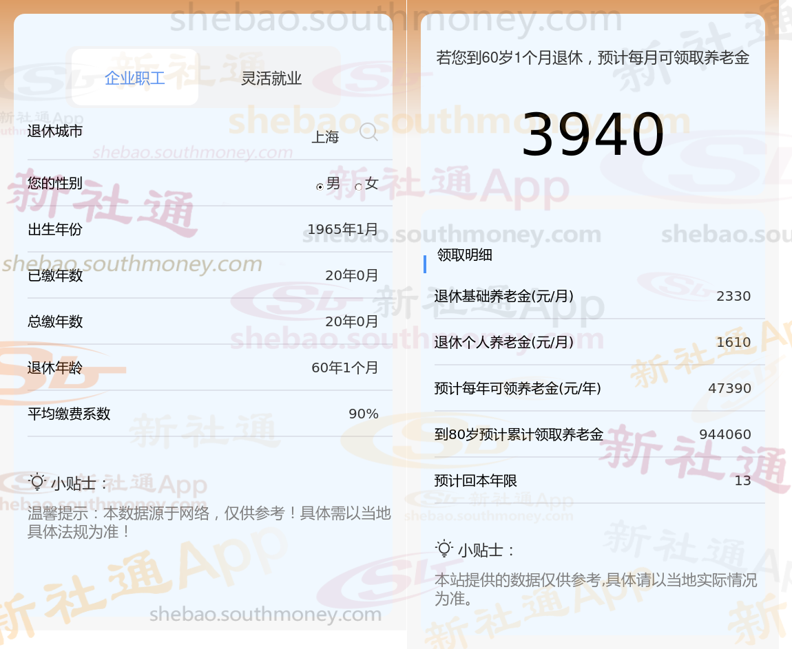 夏某,男,1965年出生,现居上海并已退休。其养老保险缴纳情况如下:总缴费年限为20年,缴费档次达到90%。根据新社通app养老金计算器的估算结果: