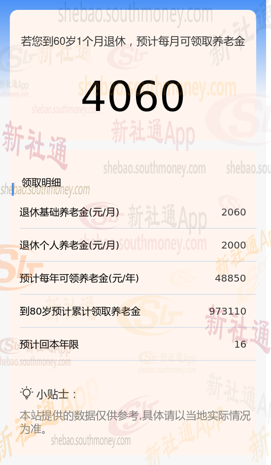 新社通app养老金计算器计算所得:
