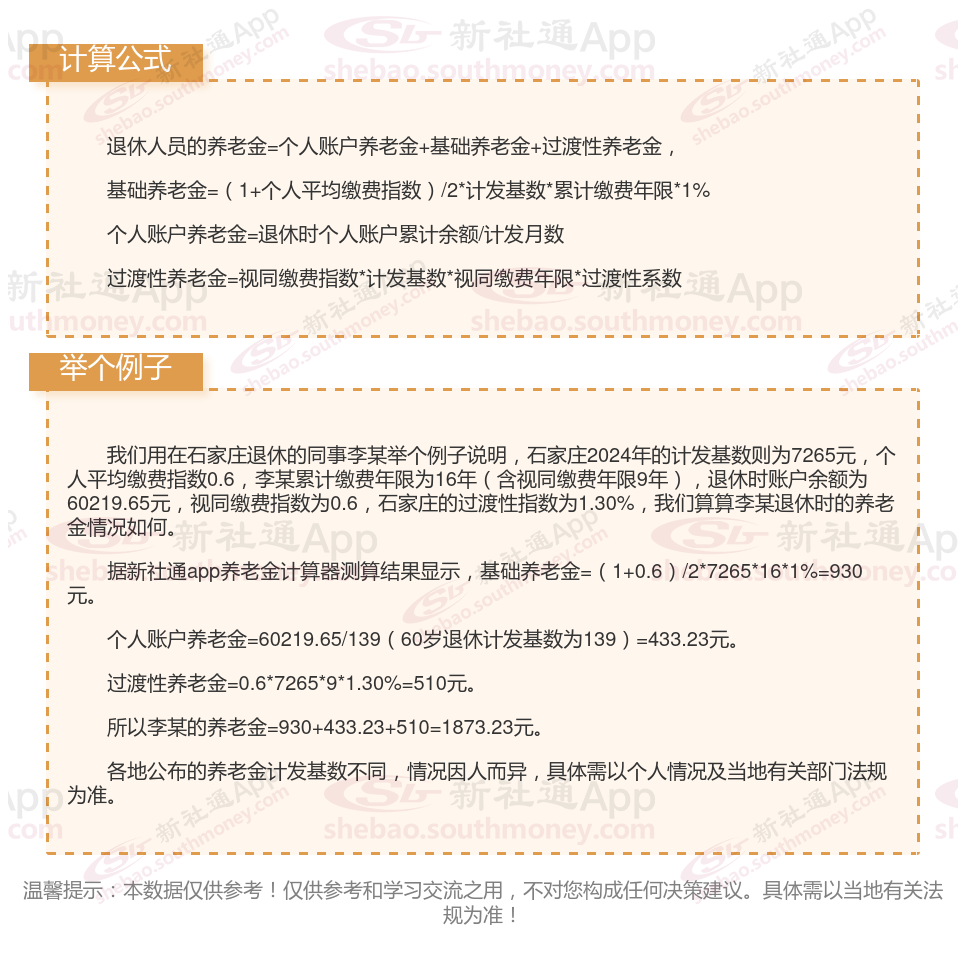 基本养老金=(退休时上年度全市城镇单位就业人员月平均工资+本人指数化月平均缴费工资)÷2×缴费年限×1%。