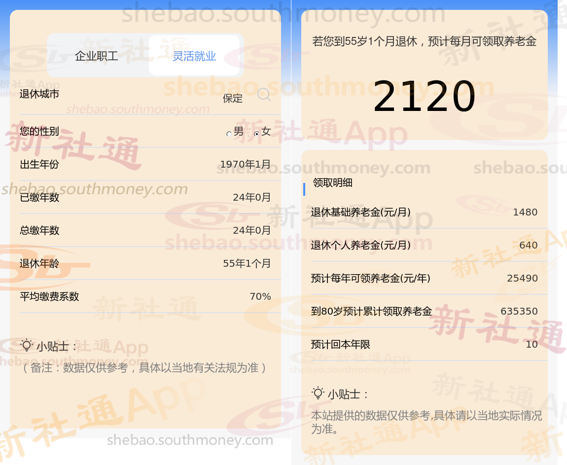 退休城市:保定,性别:女,出生年份:1970,总缴年数24年,缴费档次:70%,新社通app养老金计算器所得:
