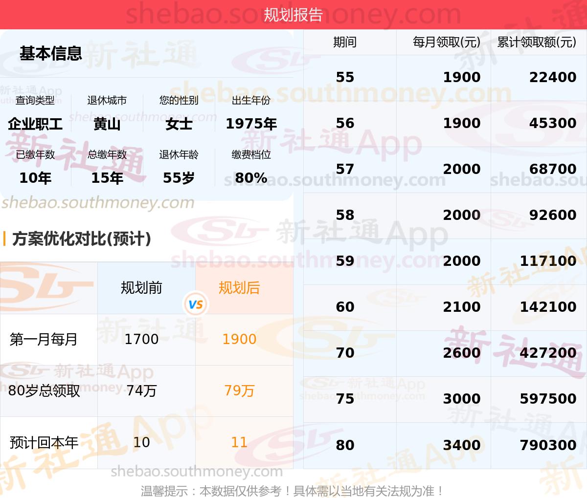 规划前:55岁约领1700元,新社通APP-养老金规划后:55岁约领1900元