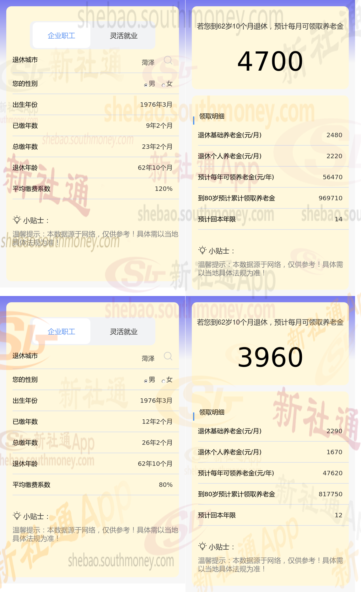 根据新社通app养老金计算器,轻松测算您的养老金!计算结果显示,沈某与老韩的养老金差距源于缴费年限和缴费档位的差异,这一差距具体体现在数额上,沈某的4700元减去老韩的3960元,等于740元。