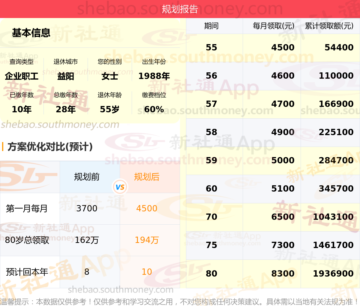 规划前:55岁第一个月约领3700元,新社通APP-养老金规划后:55岁第一个月约领4500元