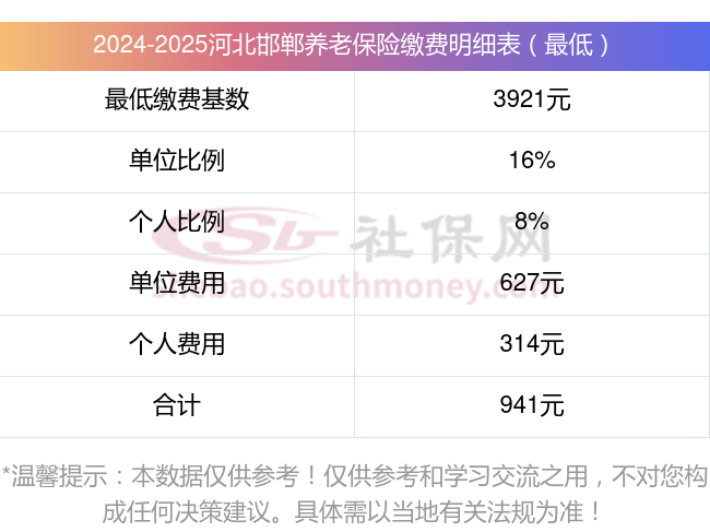 查阅新社通app显示,河北邯郸2025年河北邯郸社保养老保险缴纳基数及比例如下: