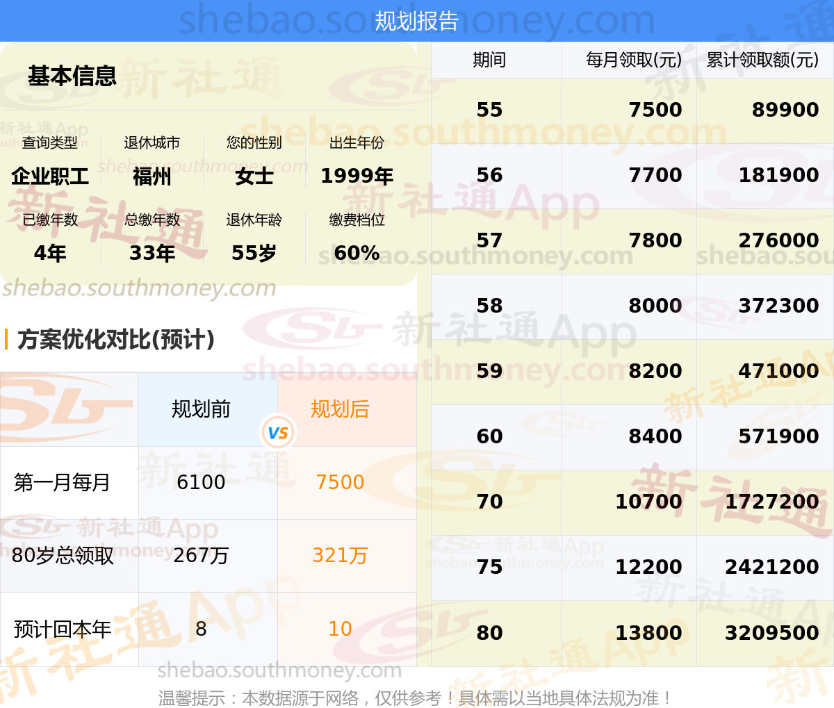 规划前:55岁第一个月约领6100元,新社通APP-养老金规划后:55岁第一个月约领7500元