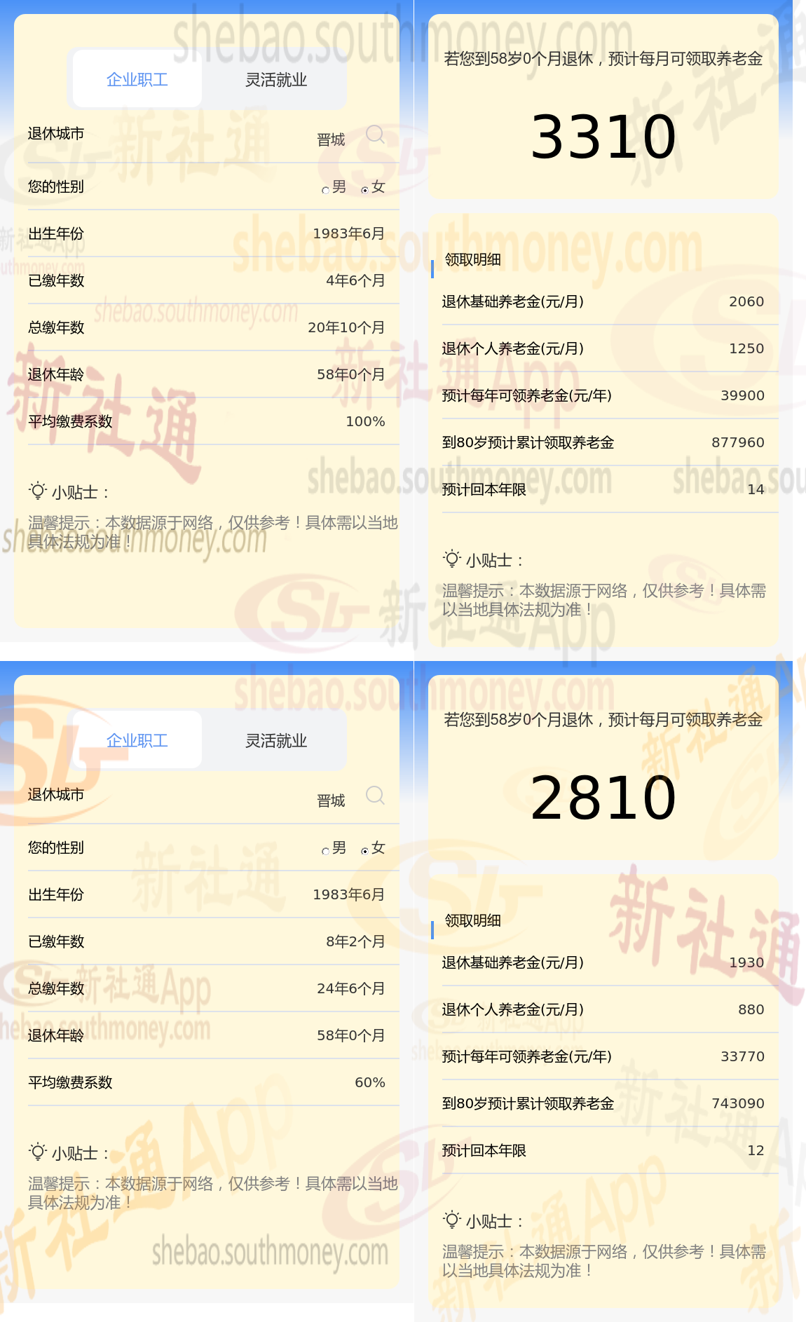 以晋城为具体案例(在此新社-app暂不将过渡养老金纳入考量):柯某在晋城退休,其社保缴费的累计年数为20年,于58周岁时正式步入退休生活,且一直以来,他都按照100%的缴费档位进行社保缴纳。