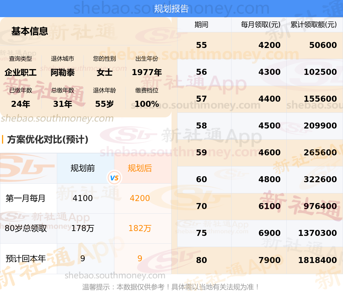 规划前:55岁第一个月约领4100元,新社通APP-养老金规划后:55岁第一个月约领4200元