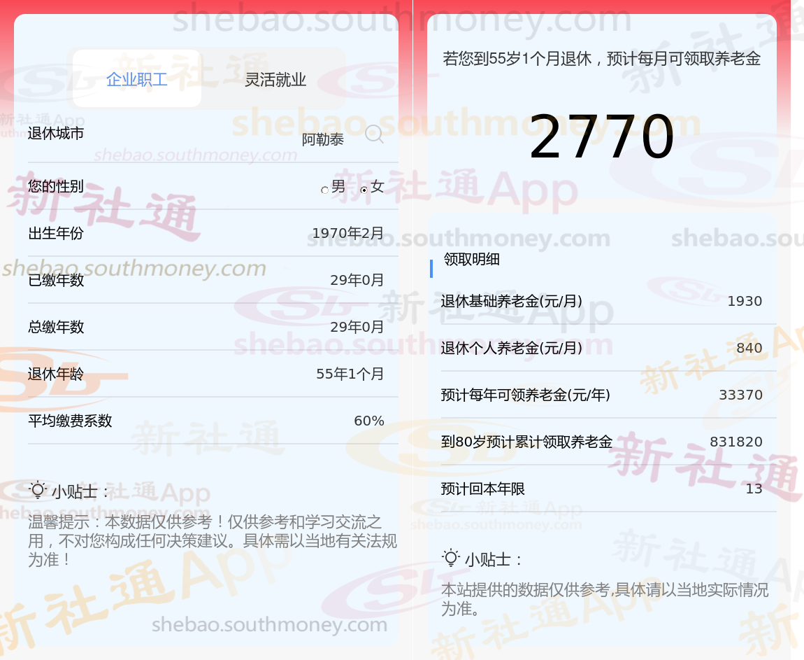 杨某,一位1970年出生的女性,现已在阿勒泰退休的情况,他的养老保险详情及预计养老金计算如下:
