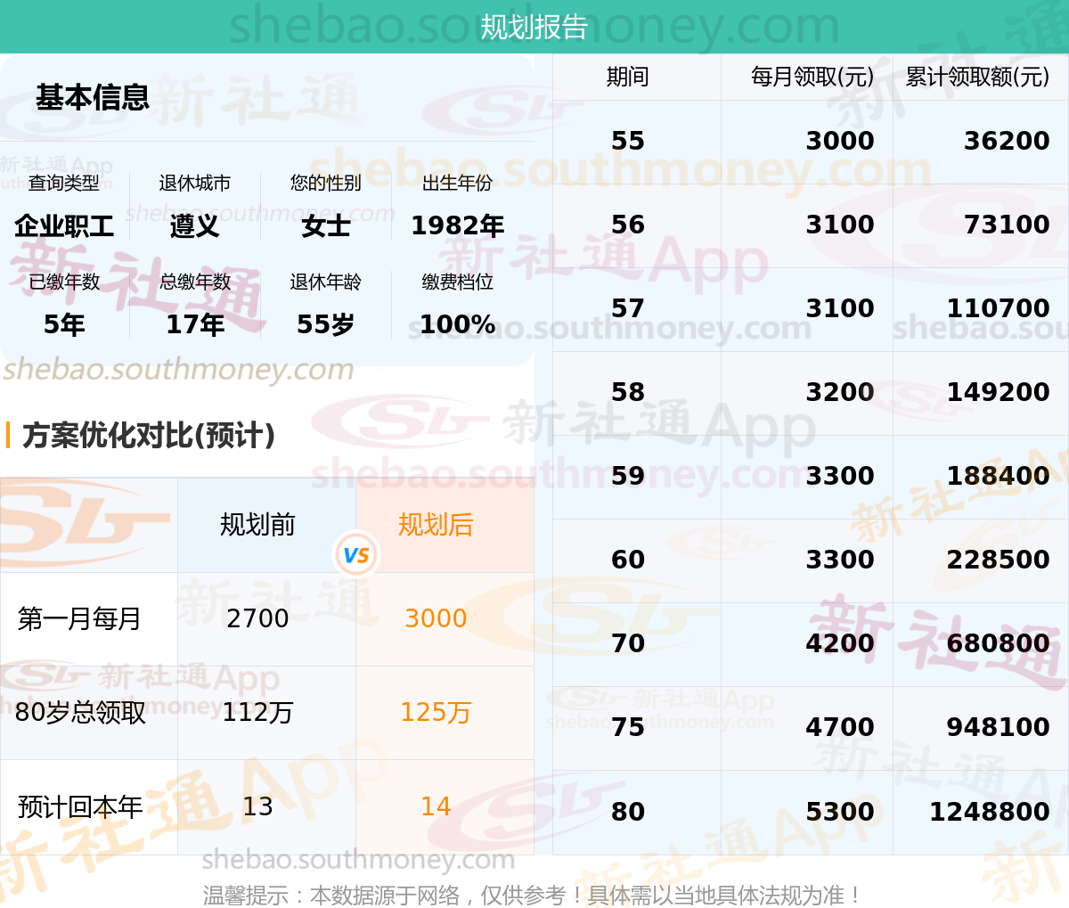 规划前:参保城市:贵州遵义,性别:女士,出生年月:1982,已缴年限:5年,总缴年数:17年,退休年龄:55岁,缴费档位:100%。