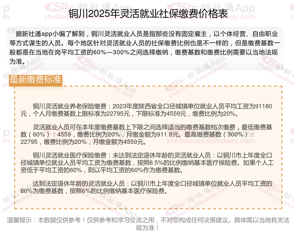 据新社通app数据显示,铜川灵活就业养老缴费基数明细如下: