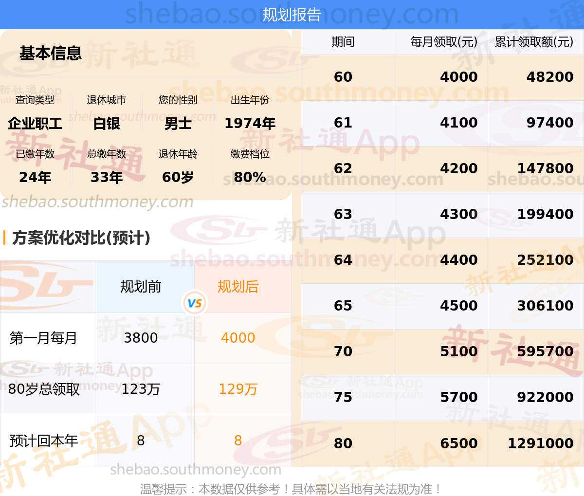规划前:60岁第一个月约领3800元,新社通APP-养老金规划后:60岁第一个月约领4000元
