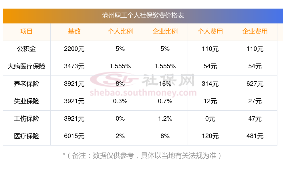 2025年沧州社保缴费多少钱?下表是2023-2024年沧州社保费用明细参考,如下: