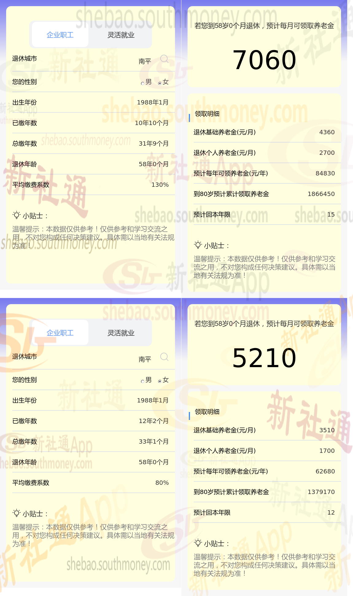 新社通app养老金计算器,轻松测算您的养老金!:两者相差7060-5210=1850元。