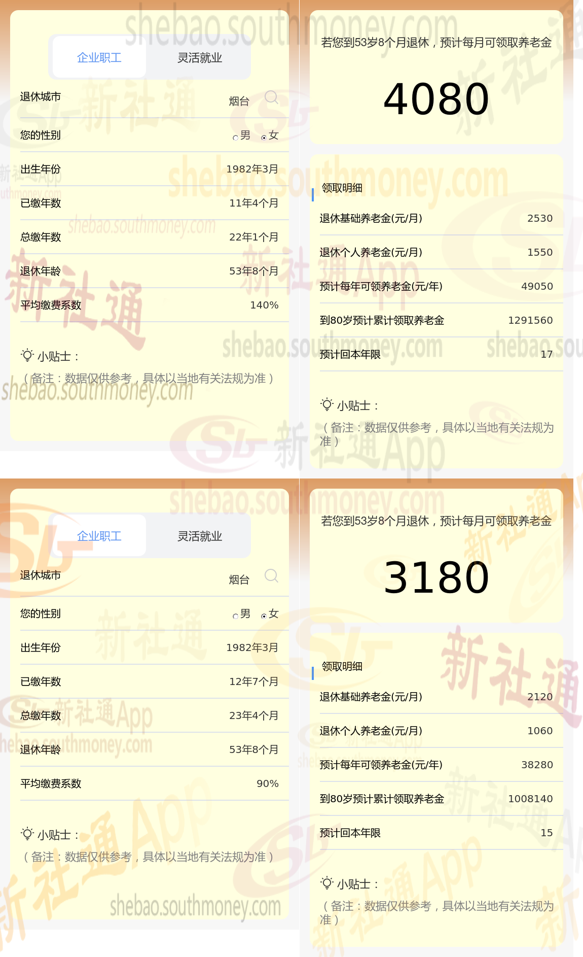 老周:退休城市烟台,缴费年限23年,退休年龄53周岁,但是按90%缴纳社保。