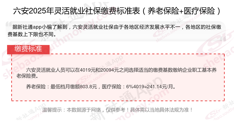 那么,灵活就业人员社保是多少钱一个月多少钱?根据新社通app-社保缴费查询工具提供的2025社保缴费标准详情数据: