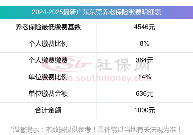据新社通app显示,广东东莞职工养老保险最低缴费基数为:4546元;单位和个人的缴费比例分别为:14%、8%;