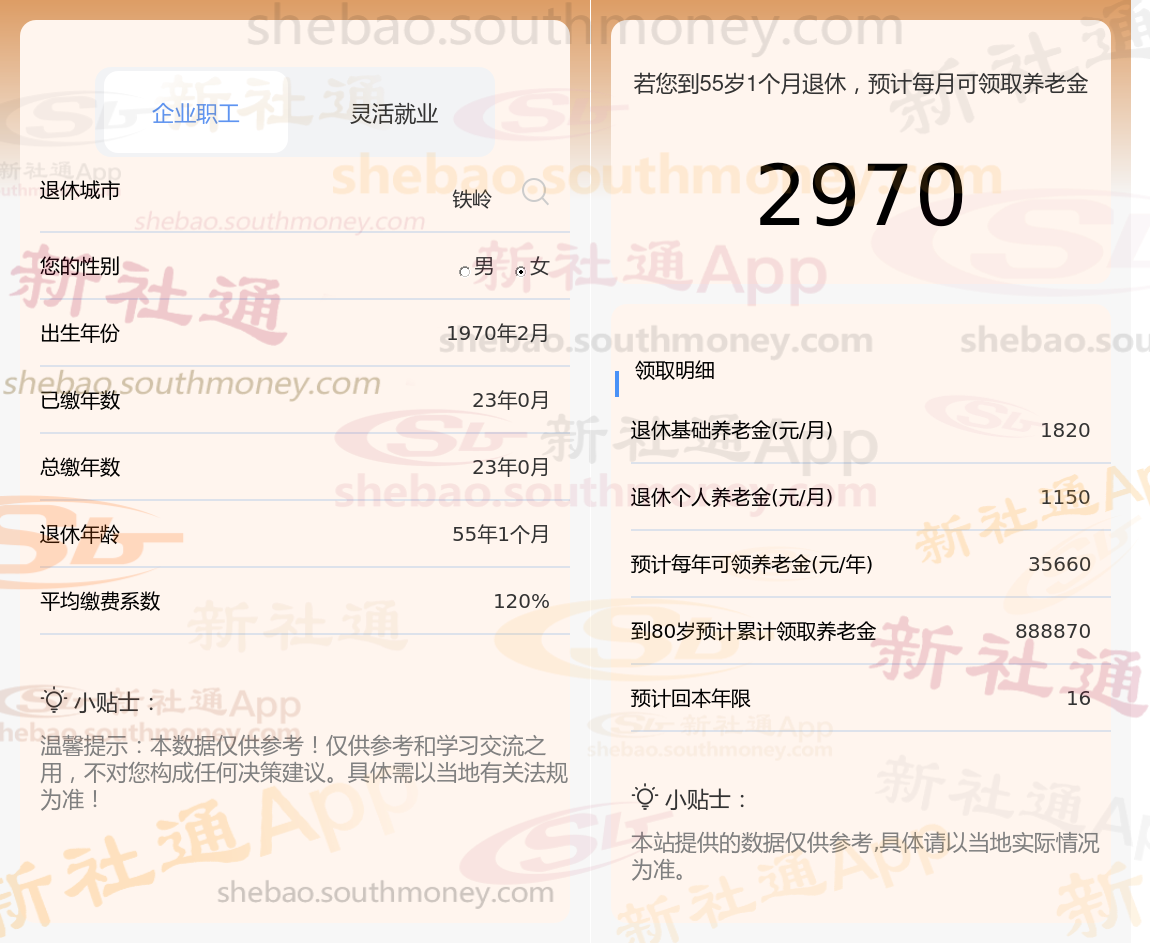 网友沈某退休城市在铁岭,性别:女,出生年份:1970,总缴年数23年,缴费档次:120%