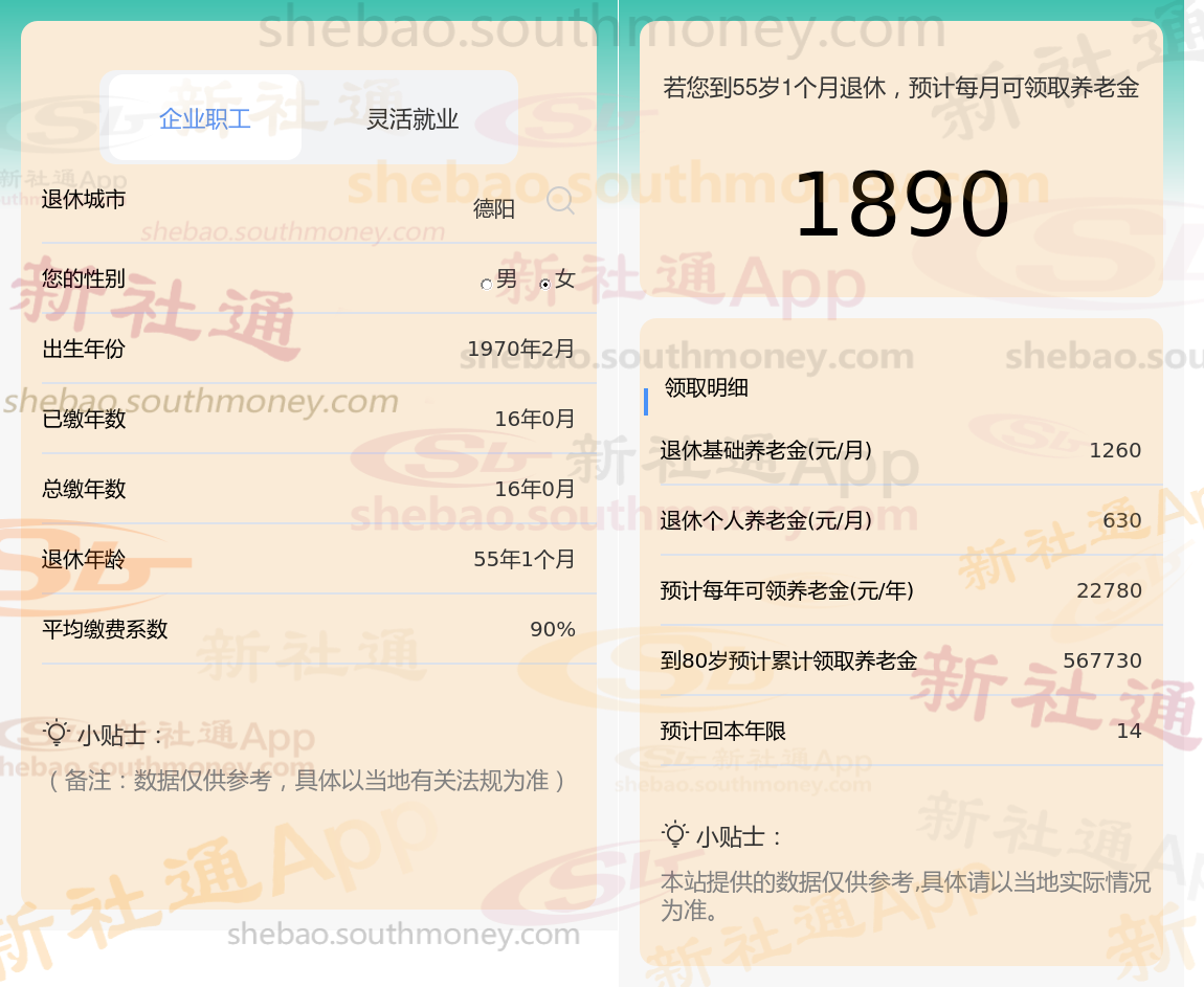 退休城市:德阳,性别:女,出生年份:1970,总缴年数16年,缴费档次:90%,新社通app养老金计算器所得: