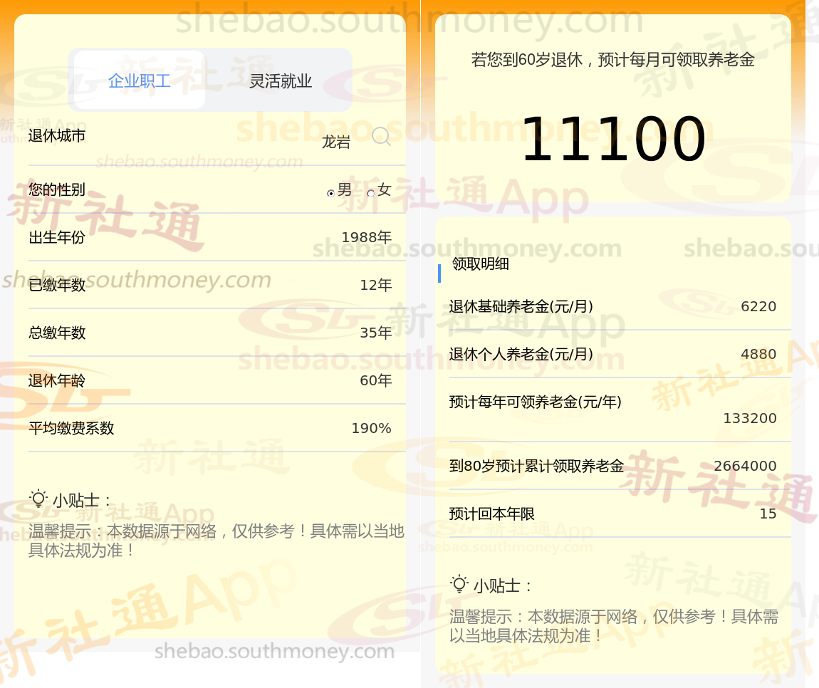 通过新社通APP-养老金计算所得:退休城市、出生年份、退休年龄、缴费系数都相同的情况下,社保缴费年限累计35年时,计算如下: