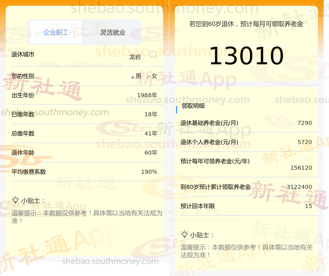 通过新社通APP-养老金计算所得:退休城市、出生年份、退休年龄、缴费系数都相同的情况下,社保缴费年限累计41年时,计算如下: