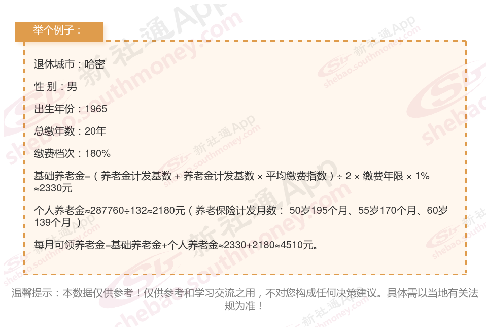 网友康某退休城市在哈密,性别:男,出生年份:1965,总缴年数20年,缴费档次:180%