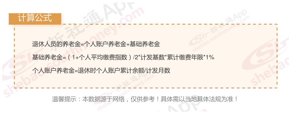 基本养老金计算公式为:(退休时上年度全市城镇单位就业人员月平均工资+本人指数化月平均缴费工资)÷2×缴费年限×1%。