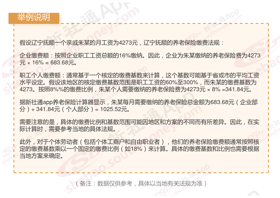据新社通app获悉,辽宁抚顺2025年养老保险缴费金额的计算方法可以根据不同的参保类型有所差异。以下是企业职工参保缴费金额计算方法的举例: