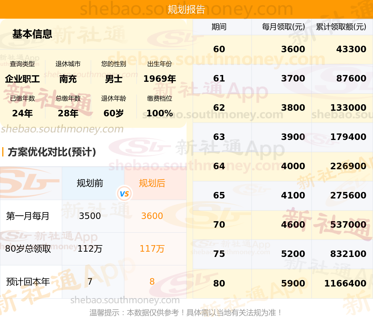 规划前:60岁第一个月约领3500元,新社通APP-养老金规划后:60岁第一个月约领3600元