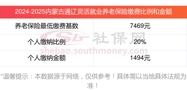 据新社通app显示,内蒙古通辽灵活就业养老保险缴费基数2024-2025年最新标准如下: