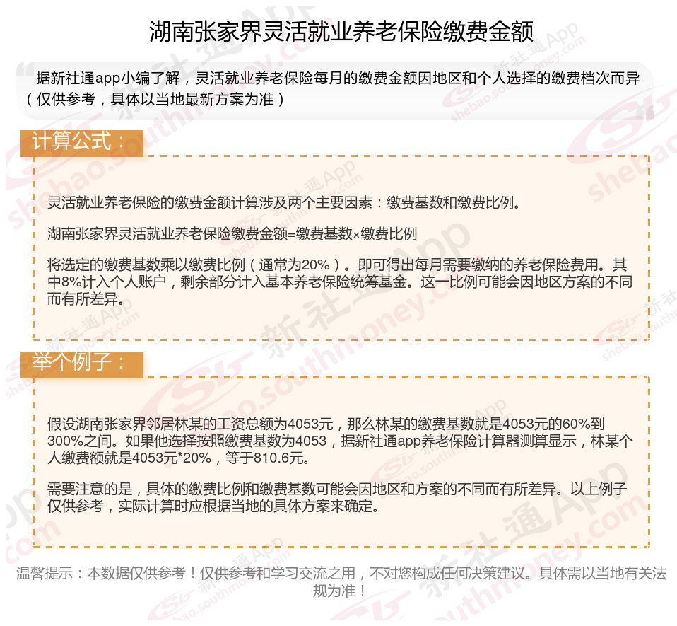 据新社通app显示,2024-2025年湖南张家界灵活就业人员养老保险的缴费标准是根据缴费基数来确定的: