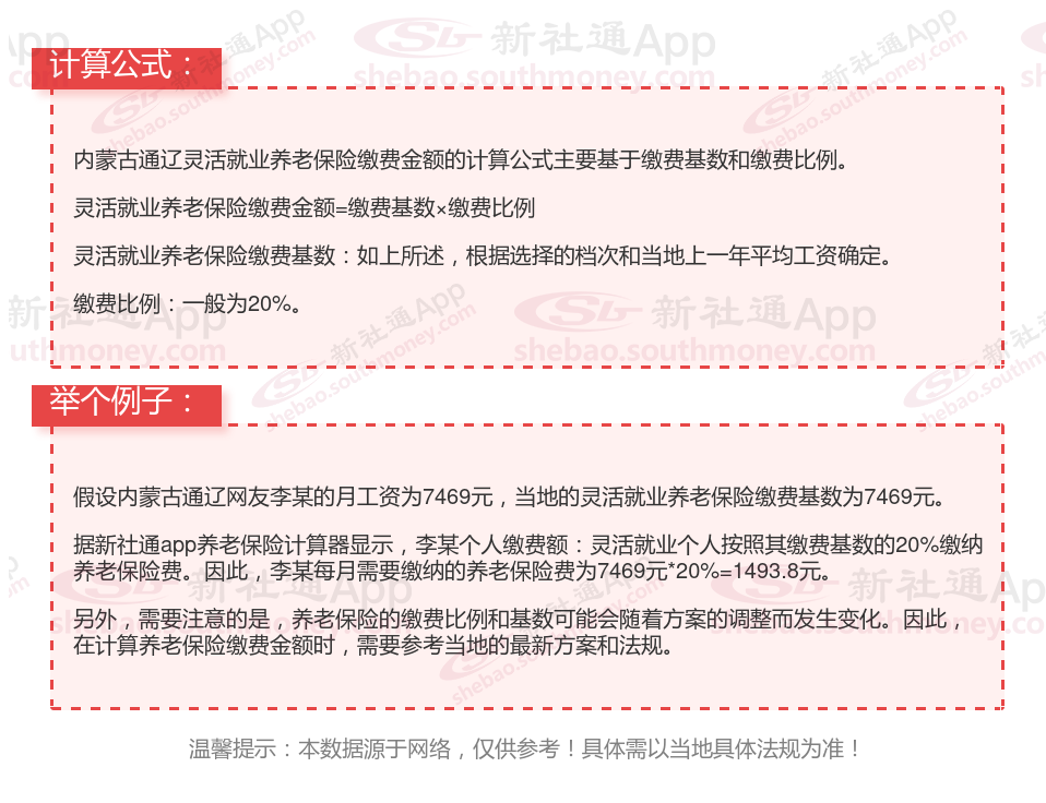据新社通app显示,2024-2025年内蒙古通辽灵活就业人员养老保险的缴费标准是根据缴费基数来确定的: