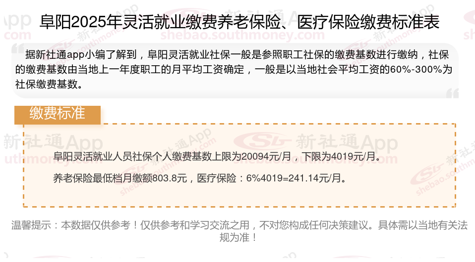 据新社通app数据显示,阜阳灵活就业人员养老保险缴费基数2024-2025年最新标准如下: