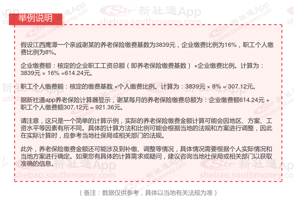 据新社通app显示,江西鹰潭养老保险缴费基数2024-2025年最新标准如下: