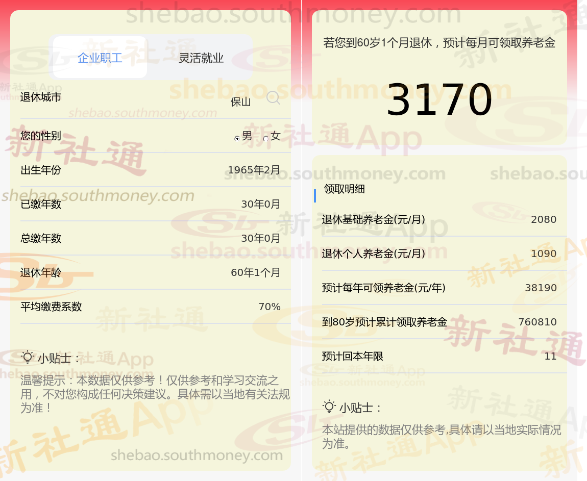个人基础信息:男性,1965年出生,保山退休人士,拥有30年的缴费年限,缴费档次为70%。