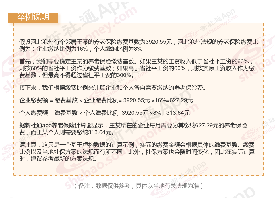据新社通app显示,河北沧州职工养老缴费基数2024-2025年最新标准是多少,河北沧州养老保险基数明细如下: